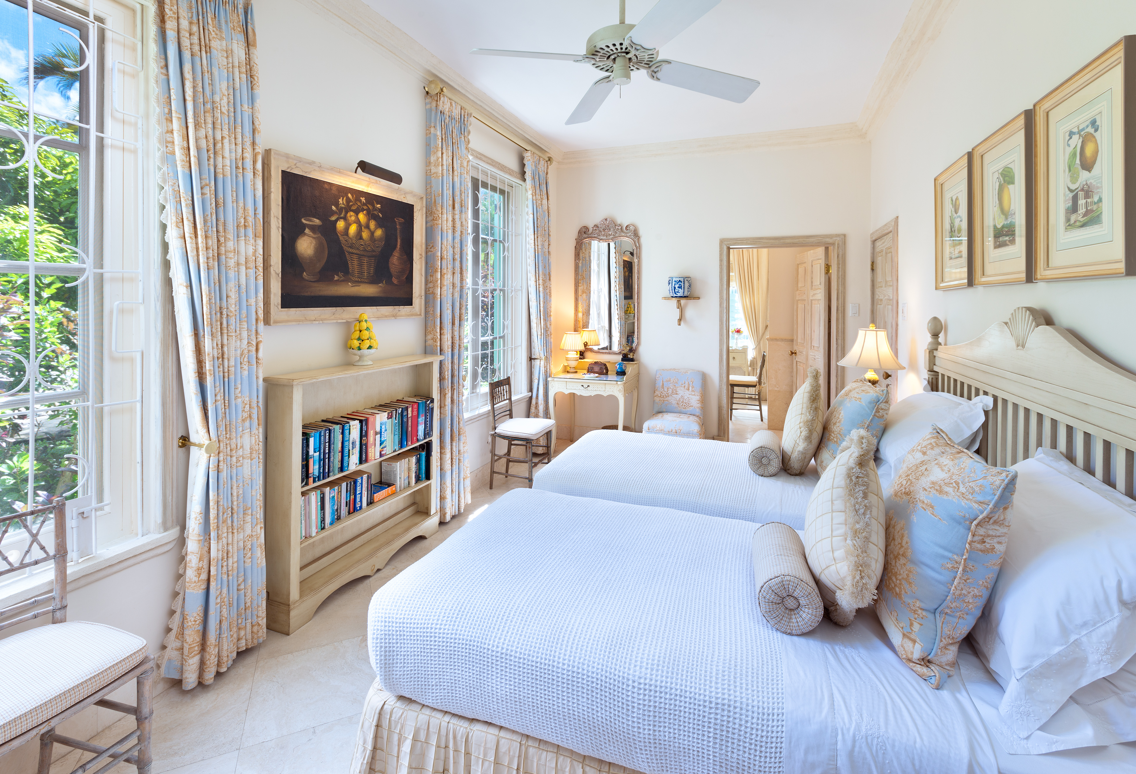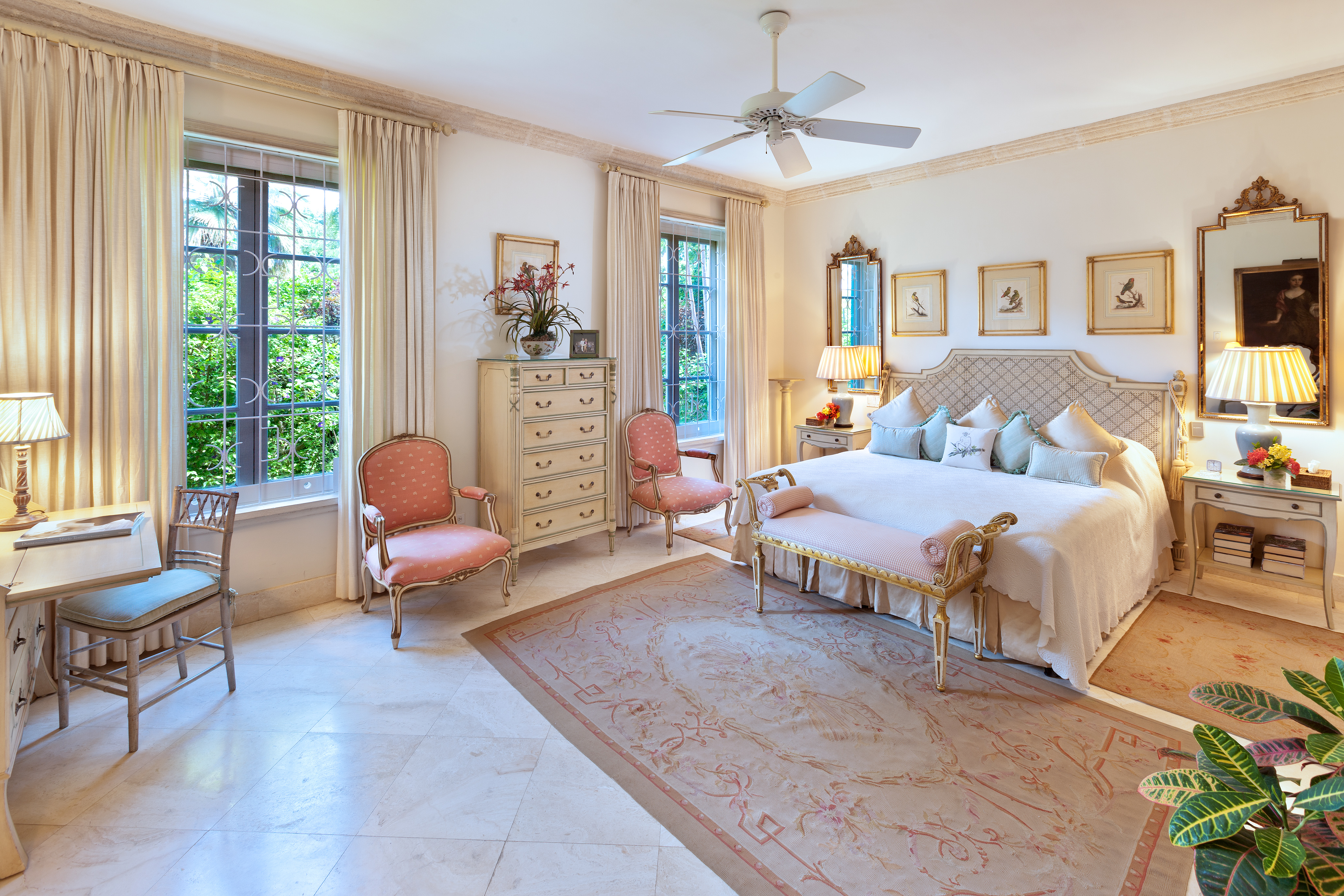 Leamington's main house, the Pavilion, features four air-conditioned bedrooms, each with a spacious ensuite marble bathroom. Two of the guest rooms are located off the main salon, while a third guest bedroom and the opulent master suite, featuring a stunning canopied bed, are within a more recently built wing.