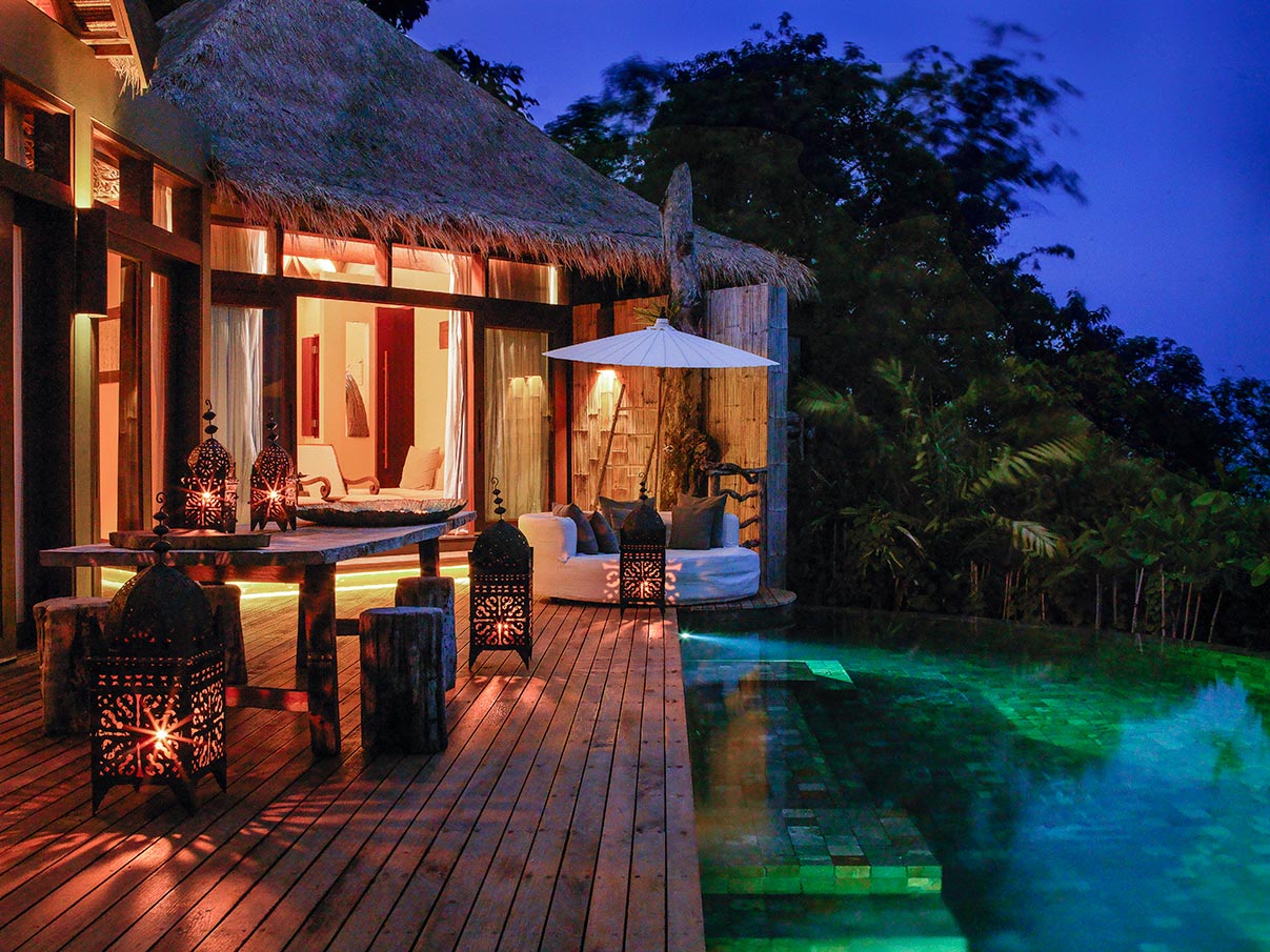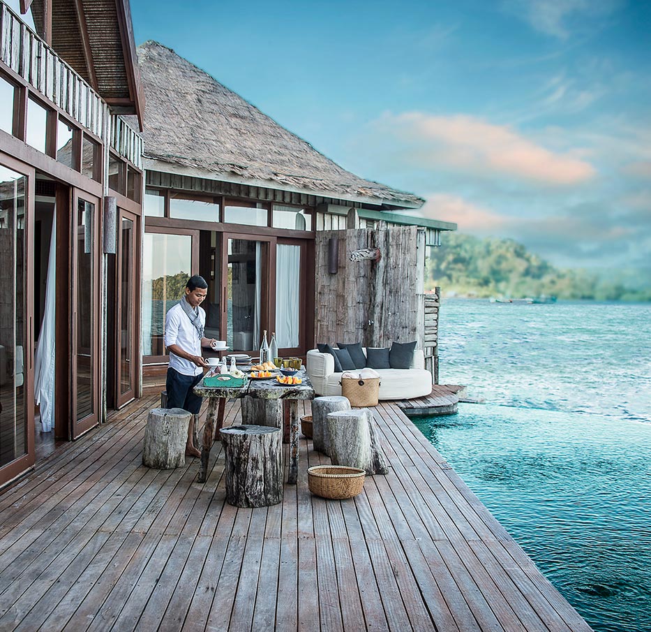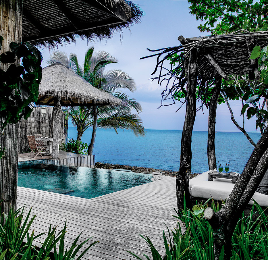 On one island are the resort's 27 villas situated either on the hilltop, beachfront or over the water. Whichever location you choose, picturesque views, natural decor and luxurious features, such as your own private pool, will welcome you.