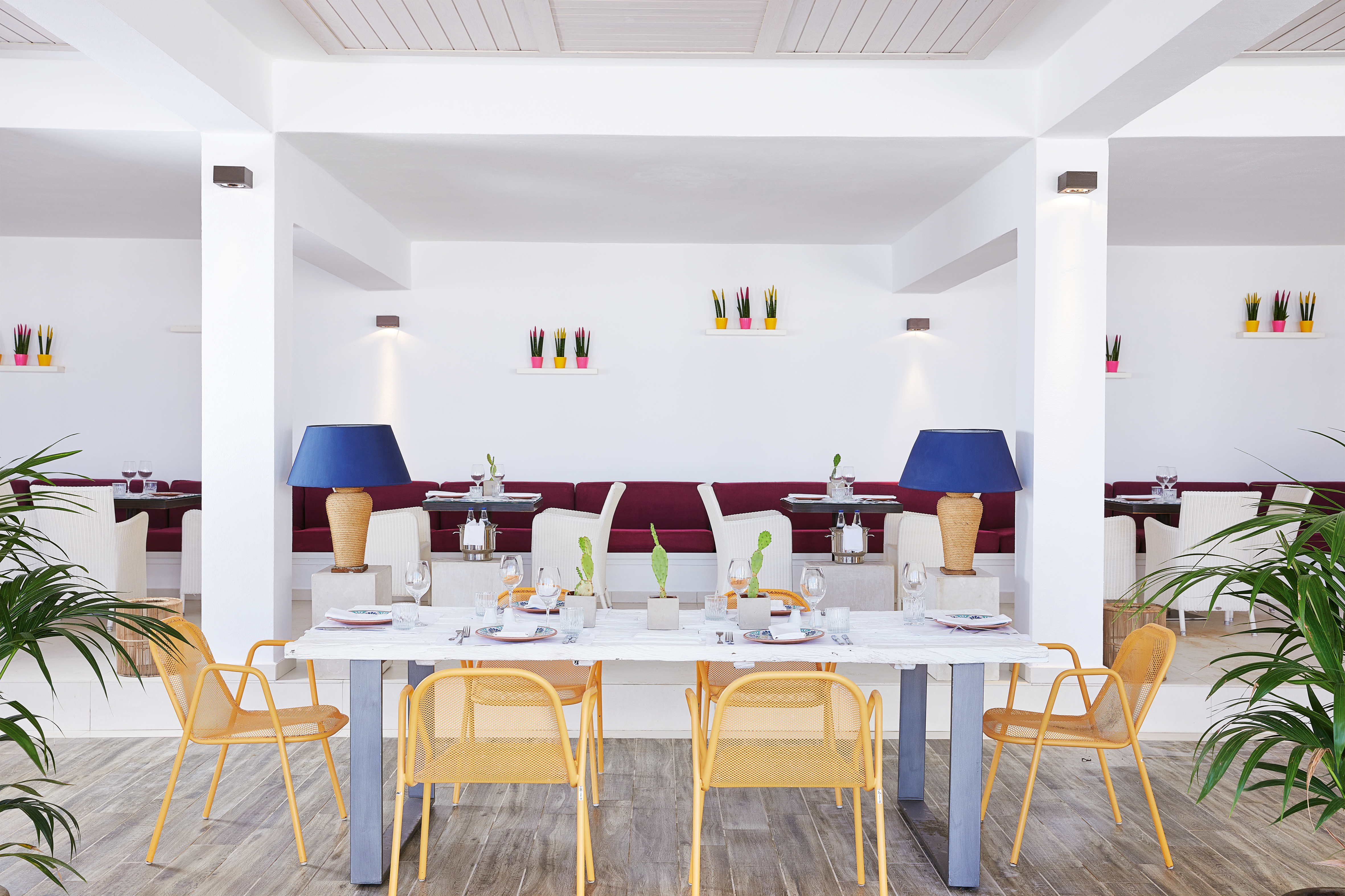 The resort’s signature colour of white is a theme throughout the light-filled accommodation, with pristine furnishings given added touches of azure blue and rustic browns, reflecting views of the sea and sand beyond. Choose from a sea or lush mountain view, with upgraded rooms such as bungalows and suites offering additional space, some with a swim up or shared pool.