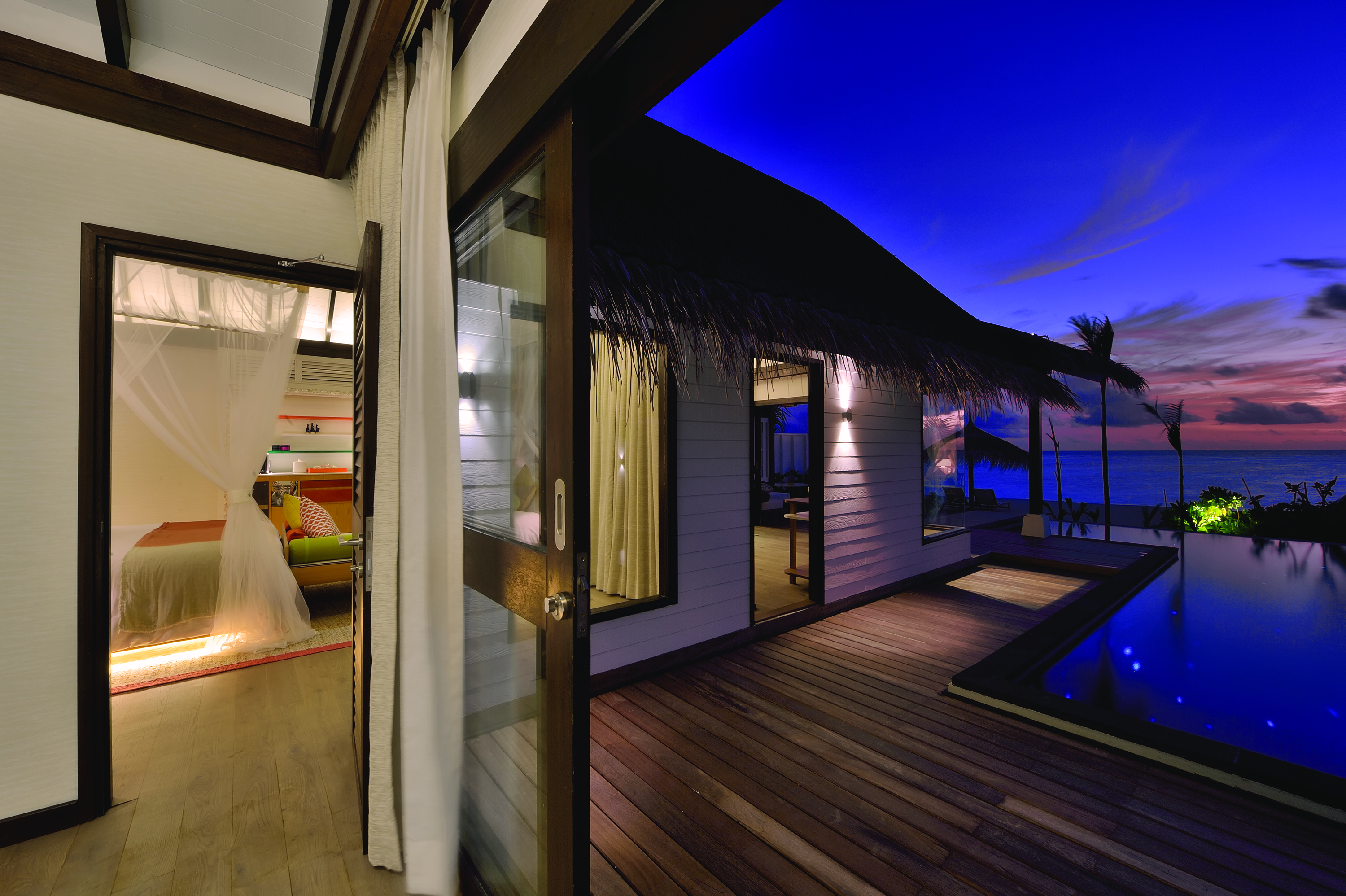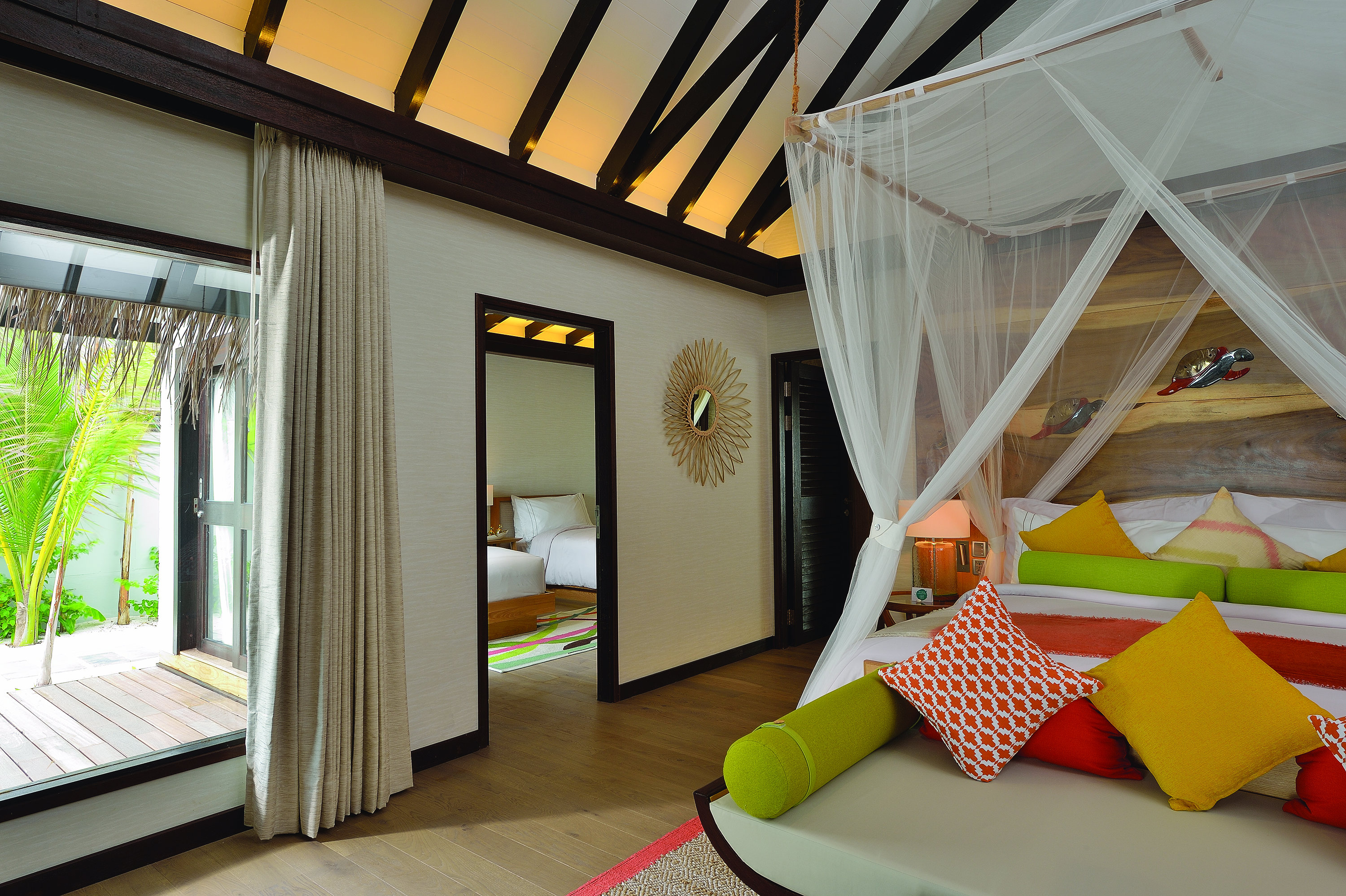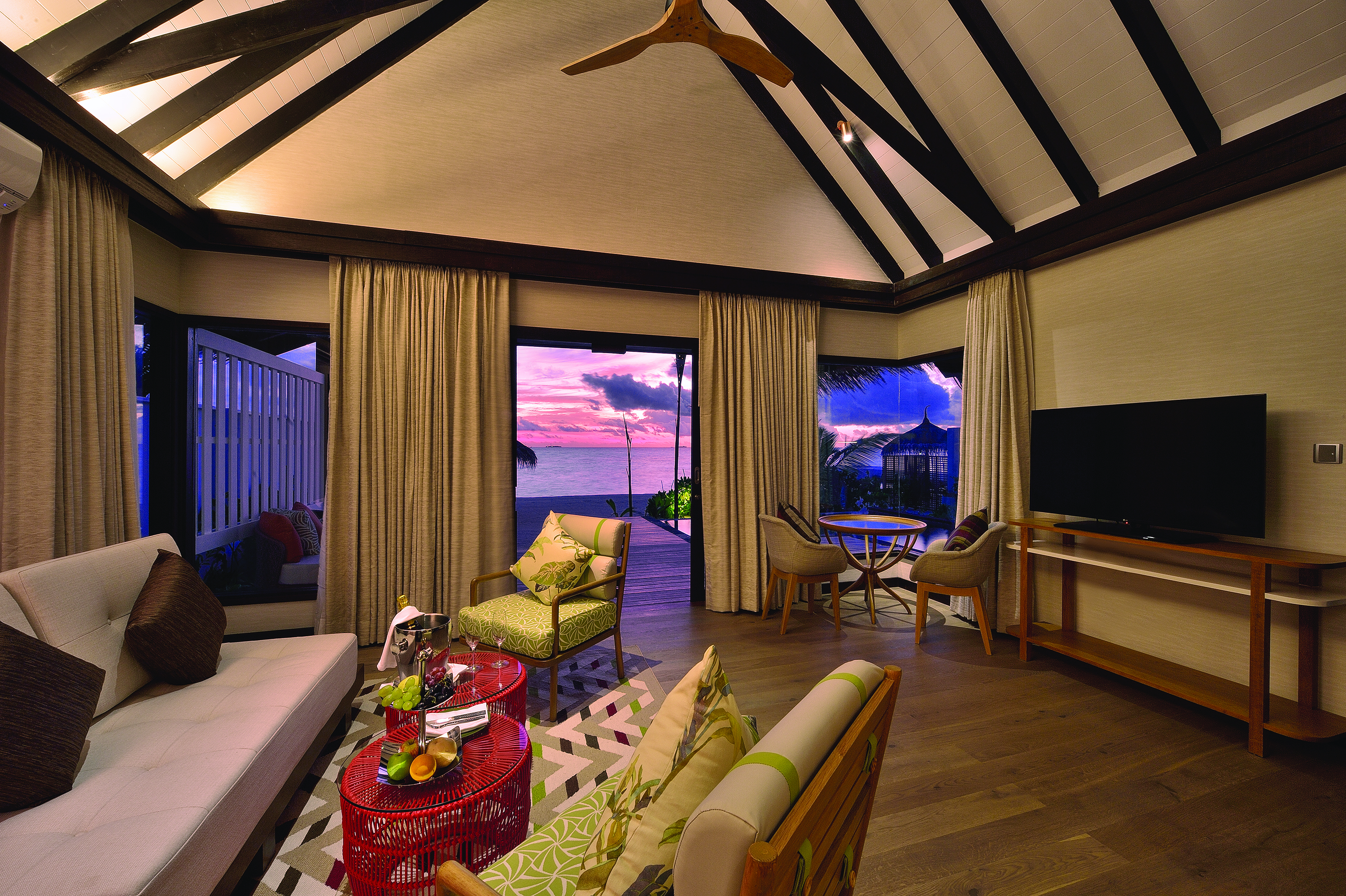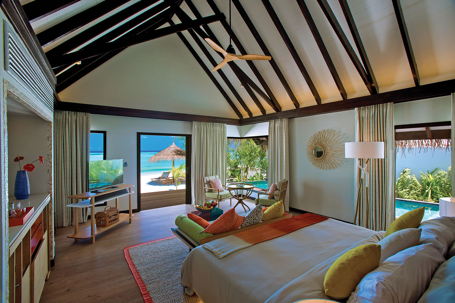 Villas and Pavilions are spacious and light-filled and you can choose to stay on the beach or overwater. Architecture here is modelled on traditional Maldivian homes, whilst interiors are creatively appointed with tasteful modern décor and vibrant splashes of colour.