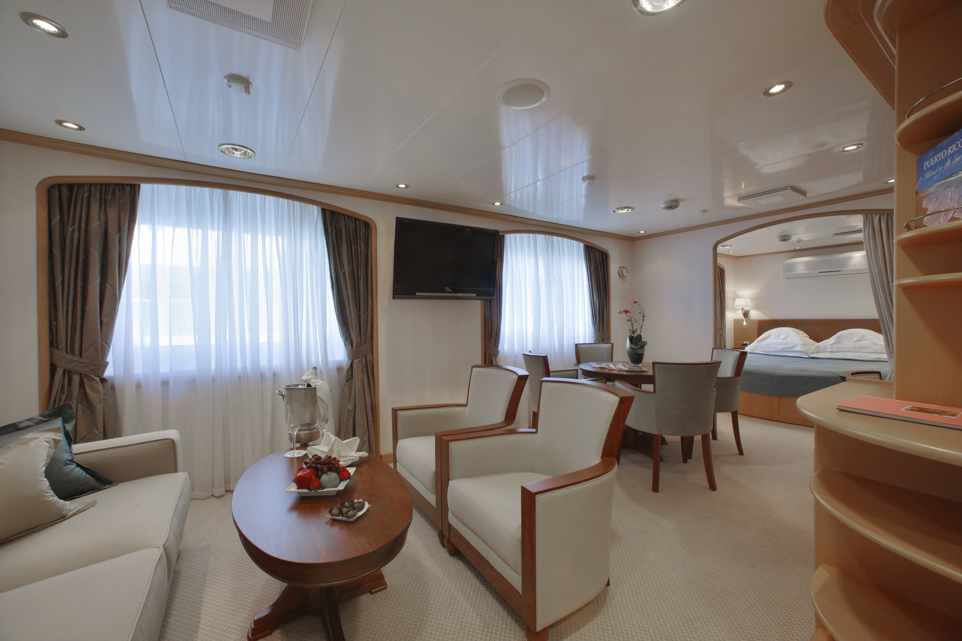 On board there are just 54 tasteful Yacht Club State Rooms, each with ocean view windows, as well as an open living area with sofa, desk and chair. For guests’ comfort there are luxury robes, slippers and toiletries, as well as flat screen TV, hairdryer, safe, telephone and climate control. Upgrades to Commodore Suites can be requested, with two Yacht Club Staterooms converted, whilst the Owner or Admiral Suite each offers more spacious accommodations and bathrooms.