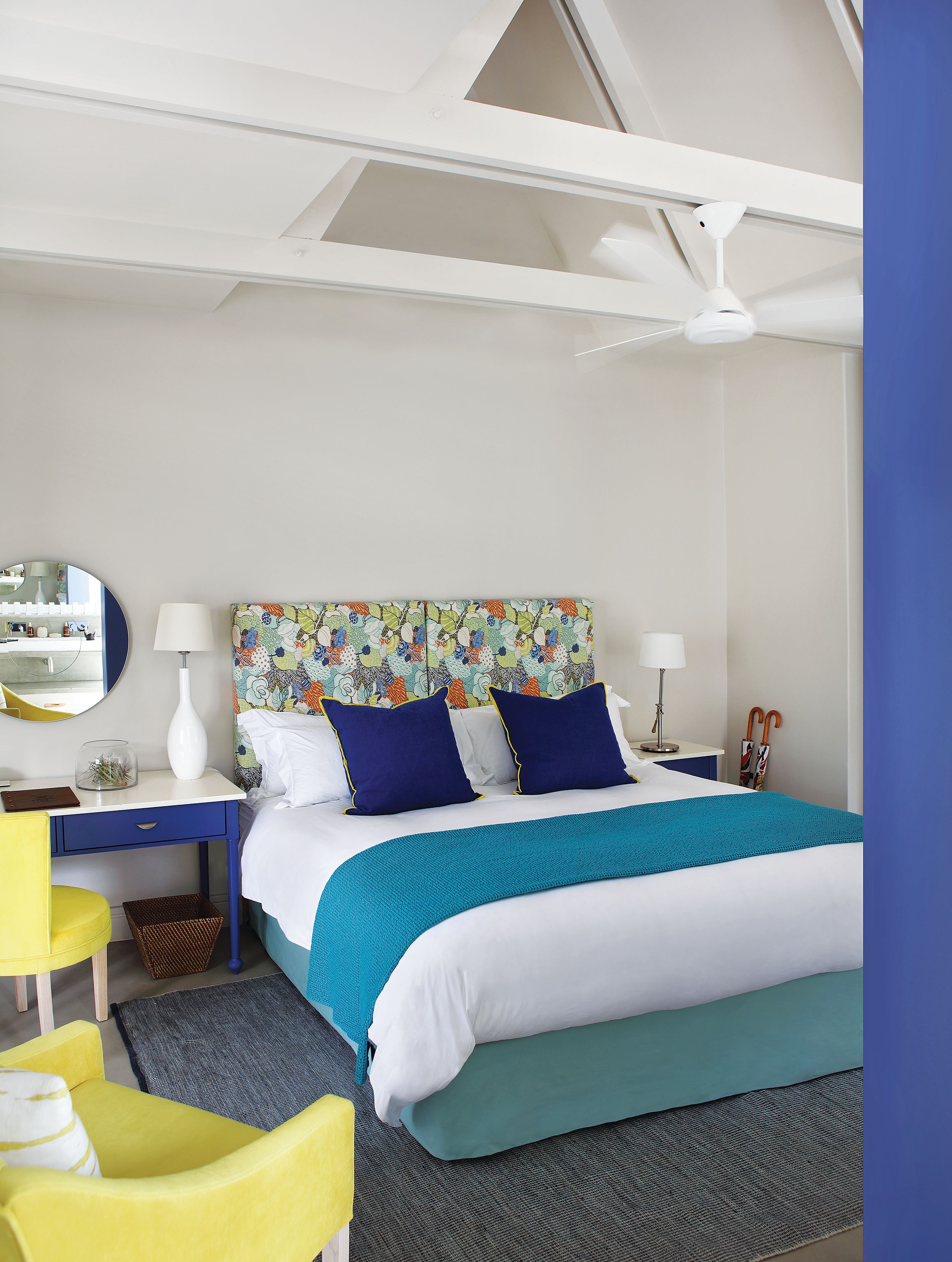 The 18 suites look out over the gardens, pool or the neighbouring seaside properties beyond with sounds of the ocean close by. Appointed in bright whites with flashes of turquoise, all suites evoke beachside charm, too.