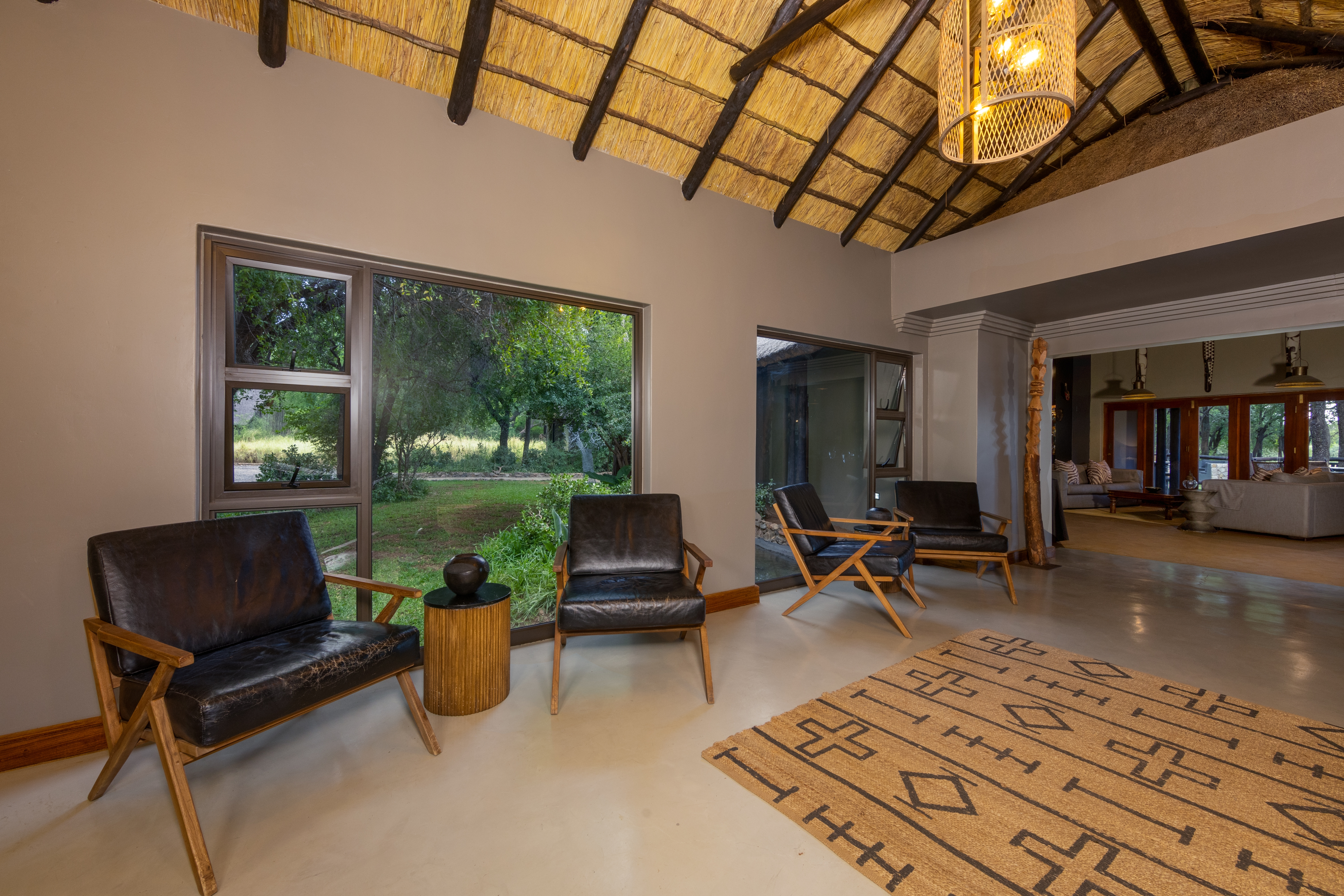 The central lodge area overlooks a busy waterhole, allowing you to favour the sight of elephants and buffalo stopping by for a drink while you enjoy a sundowner on the deck or a dip in one of the cool, inviting pools.