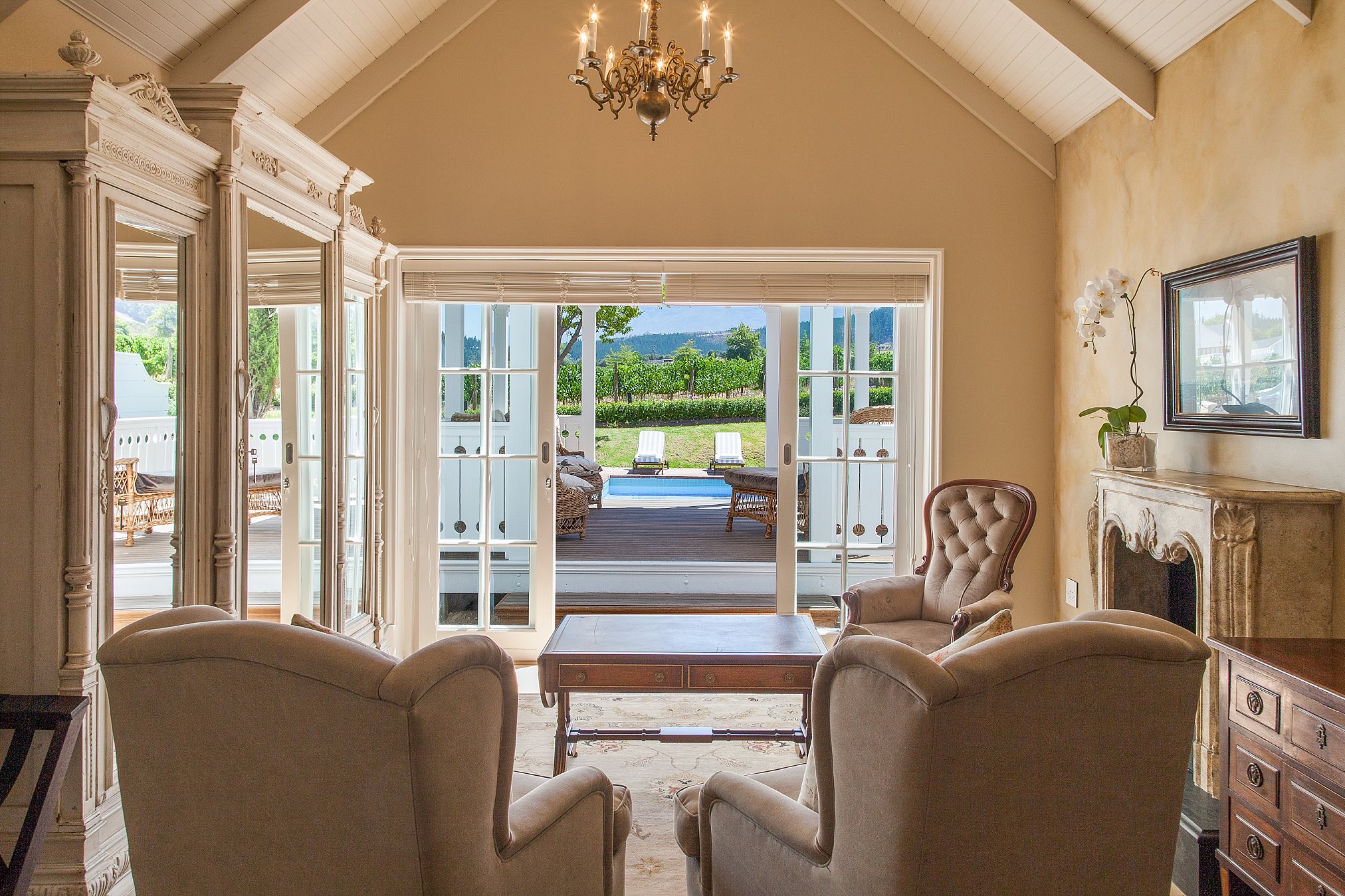A mere five minutes from the historic town of Stellenbosch, the estate boasts dramatic mountain ranges, endless rows of lush vineyards and hectares of gardens shaded by giant Oak trees.