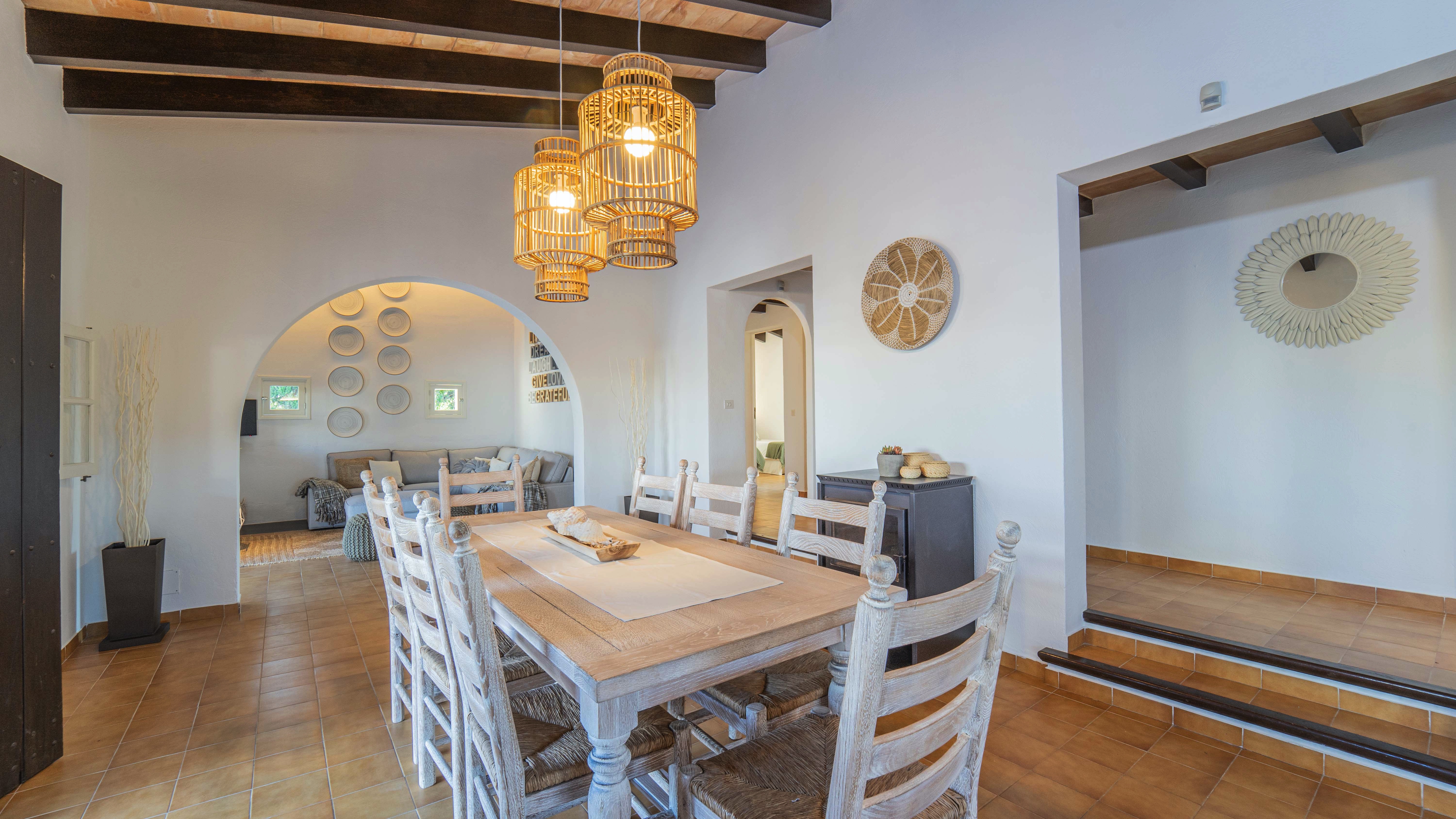 Inside, the décor is cool and stylish, with white and beige tones throughout, plus modern touches in the wall art. The living space is open with the lounge area leading through to the dining table and kitchen. In turn each of these spaces has beamed ceilings, with doors opening onto the terrace area.