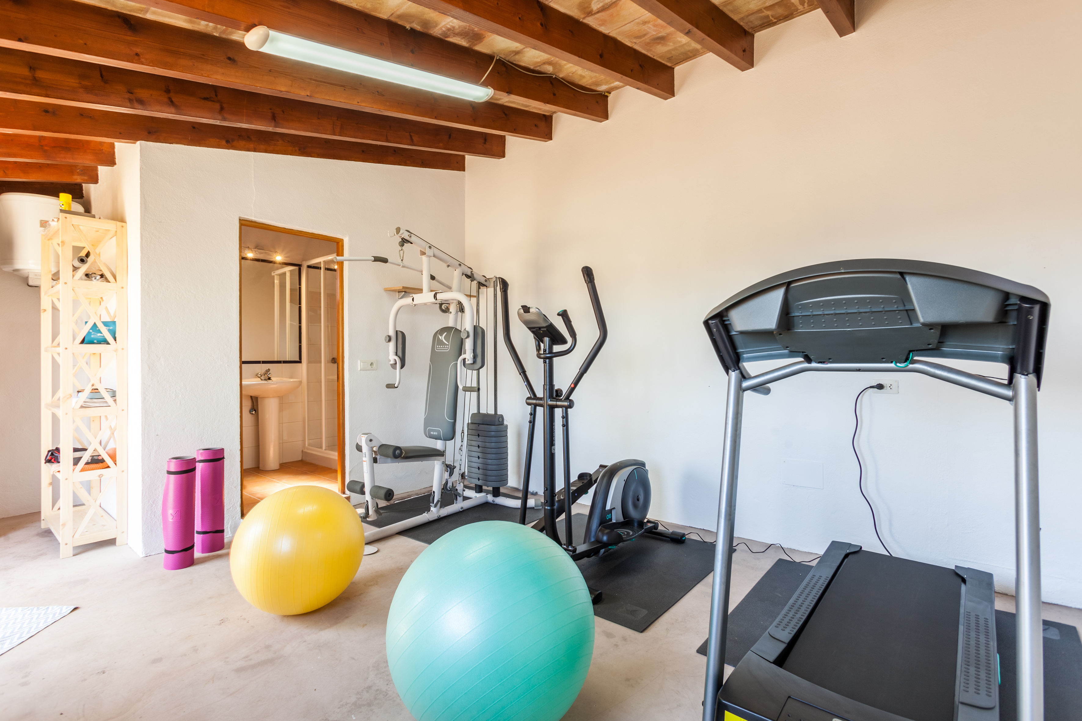 All located on the ground floor, there are four airy and beautifully designed bedrooms (two double / two twin), with crisp white linens and splashes of colour in the artwork and cushions. There are also three separate bathrooms, as well as a mini gym area with shower room.